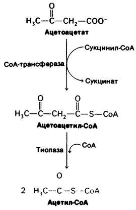 1. Мозг. Глюкоза-практически единственный источник энергии в мозгу человека, за исключением условий продолжительного голодания. В мозгу нет запасов богатых энергией молекул, поэтому он нуждается в постоянном поступлении глюкозы. Мозг поглощает около 120 г глюкозы в сутки, что соответствует в энергетическом выражении 420 ккал. В состоянии покоя мозг расходует около 60% того количества глюкозы, которое в целом потребляется в организме. При голодании глюкозу в качестве источника энергии для мозга заменяют Кетоновые тела (ацетоацетат и его восстановленный аналог 3-гидроксибу- тират). Ацетоацетат активируется путем переноса СоА с молекулы сукцинил-СоА; при этом образуется ацетоацетил-СоА (рис. 23.12). Затем расщепление тиолазой дает две молекулы ацетил-СоА, которые включаются в цикл трикарбоновых кислот. Жирные кислоты не могут служить источником энергии для мозга, так как они связаны с альбумином и неспособны проникнуть через гематоэнцефалический барьер. Итак, кетоновые тела-транспортабельный эквивалент жирных кислот. Чуть ниже мы обсудим, почему использование в качестве энергетических ресурсов не глюкозы, а кетоновых тел имеет важное значение для того, чтобы свести к минимуму распад белков во время голодания.