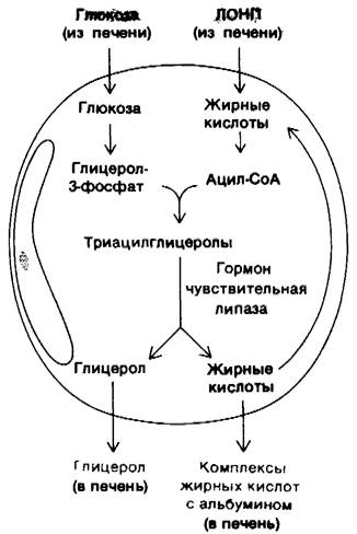 Рис. 23.14. Синтез и расщепление триацилглицеролов в жировой ткани. Жирные кислоты поступают в жировую ткань в виде липопротеинов очень низкой плотности (ЛОНП)