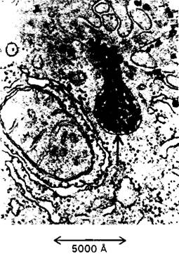 Рис. 23.15. Электронная микрофотография части клетки печени, активно участвующей в синтезе и секреции частиц липопротеинов очень низкой плотности (ЛОНП). Стрелкой отмечен пузырек, выбрасывающий свое содержимое-частицы ЛОНП