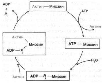 приводит к его диссоциации на актин и миозин. В результате вновь образуется комплекс миозин—АТР, входящий в новый каталитический цикл. Эти реакции идут с участием Mg2+. Важнейшая особенность рассматриваемого цикла, который был предложен Эдвином Тейлором (Edwin Taylor) на основе изучения быстрой кинетики процесса, состоит в том, что актин обладает высоким сродством к миозину и комплексу миозин—ADP—Pi, но низким сродством к комплексу миозин—АТР. Вследствие этого актин то присоединяется к миозину, то высвобождается из комплекса с ним - в зависимости от гидролиза ATР. Как будет показано ниже, это АТР-зависимое изменение во взаимодействии миозина и актина лежит в основе генерирования силы При мышечном сокращении.