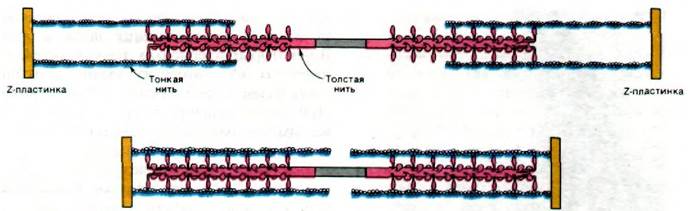 Полярность структуры толстых и тонких нитей играет решающую роль в координированном движении. Благодаря тому, что участки взаимодействия на нитях актина и миозина ориентированы одинаково по отношению друг к другу, в ходе скольжения нитей происходит сложение сил, развивающихся в каждом участке взаимодействия. Кроме того, посередине между двумя Z-пластинками направление нитей меняется на противоположное (рис. 34.15). В итоге две тонкие нити при взаимодействии с одной толстой скользят навстречу друг другу, что приводит к уменьшению расстояния между Z-пластинками (рис. 34.16).