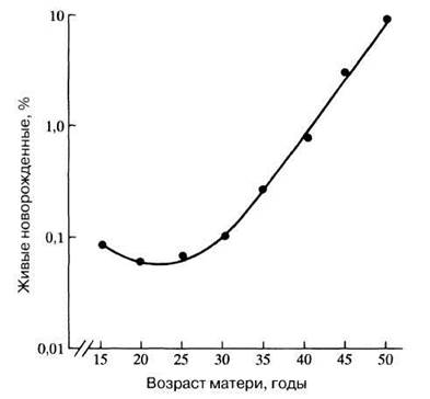 Вероятность рождения детей с синдромом Дауна зависит от возраста матери (рис. 25.28), тогда как корреляции с возрастом отца не обнаружено. В возрасте 20 лет риск составляет 1 из 2000, в 30 лет — 1 из 900, в 40 лет — 1 из 100 и в 44 года — 1 из 40. Если представить эти данные в логарифмическом масштабе в виде кривой, то видно, что ее наклон с возрастом становится все круче (рис. 25.28). Возможно, это связано с тем, что яйцеклетки женщины формируются еще в период эмбрионального развития, а затем по достижении репродуктивного возраста созревают одна за другой каждый месяц. В отличие от этого у мужчин новые спермин образуются постоянно, начиная с периода половой зрелости и до смерти.