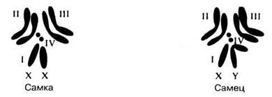 Рис. 24.16. Хромосомы самца и самки Drosophila melanogaster. Показаны четыре пары хромосом. Пара I — половые хромосомы.
