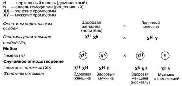Особей женского пола, гетерозиготных любому из сцепленных с полом признаков, называют носителями соответствующего рецессивного гена. Они фенотипически нормальны, но половина их гамет несет рецессивный ген. Несмотря на наличие у отца нормального гена, сыновья матерей-носителей с вероятностью 50% (1/2) будут страдать гемофилией. От брака такой женщины-носителя с нормальным мужчиной могут родиться дети с различными фенотипами (рис. 24.21).
