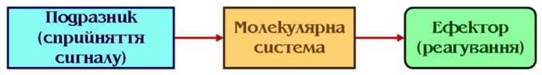 Молекулярно-біологічний рівень. У найбільш простих системах сприйняття зовнішнього сигналу часто сполучено із системою реагування (Рис. 1). Це відноситься до молекулярних комплексів ферментів, комплексів фотосинтетичних пігментів або систем мембранного переносу речовин. Так, фермент у силу спеціалізації сприймає появу тільки власного субстрату і не реагує на сполуки, часто дуже близькі до нього за хімічними властивостями. Приєднання субстрату (субстратів) приводить до змін структури ферменту, у результаті чого фермент здійснює реакцію, яку каталізує, і повертається у вихідний стан. Пігмент фотосинтезу сприймає квант світла, збуджується і передає його енергію на фотохімічні реакції. Н+-АТРаза плазмалеми «пізнає» протон, захоплює його і переносить через мембрану. Для інших речовин є свої транспортні канали, які у свою чергу не реагують або реагують слабко на чужі речовини. За механічного і хімічного контактів сприймаючої і робочої частин реагуючих систем проміжні структури тільки ускладнюють усю систему і тому просто не потрібні.