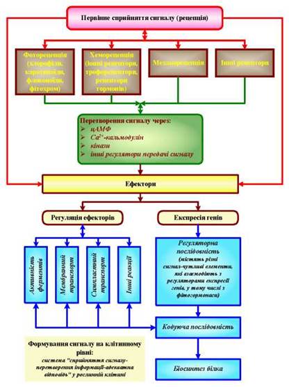 Легко уявити, що будь-які зміни в рості і розвитку рослин можуть бути визначені в якості одного з таких перетворень: вегетативний ріст пагону на якомусь відрізку часу можна розглядати як збільшення кількості листків - елементів пагону; перехід до цвітіння - як поява якісно нового елемента тощо. Розглянемо основні елементи ланцюжка «сприйняття → обробка інформації →адекватна відповідь» і їхнього зв’язку між собою, іншими елементами та фізіологічними системами рослин під час формування відповідної реакції на зміни умов середовища.