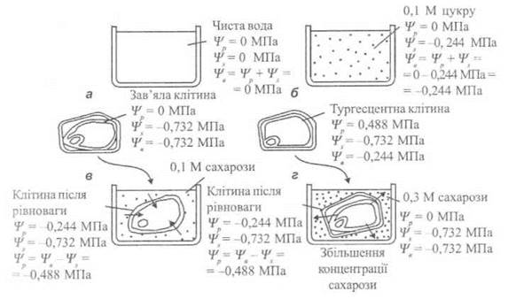 Якщо розчинити 0,1 моля сахарози в 1 л води, то концентрація отриманого розчину буде дорівнювати 0,1 М. Осмотичний потенціал такого розчину при температурі 20 °С (293 К) згідно з рівнянням (6.9) становитиме Ψs = RTCц = -0,244 МПа. Потенціал тиску в такій системі Ψp = 0, а водний потенціал розчину Ψв = Ψp + Ψs = 0 - 0,244 МПа = -0,244 МПа (рис. 6.1, б).