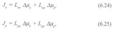 З рівнянь видно, що кожний потік залежить від обох хімічних потенціалів. Оскільки згідно з принципом симетрії феноменологічних коефіцієнтів Онзагера Lвр = Lрв, для опису залежності двох потоків від двох рушійних сил потрібно знати лише три феноменологічні коефіцієнти.