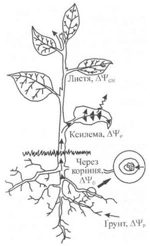 Вода є основним середовищем, в якому відбуваються біохімічні та біофізичні процеси, що забезпечують метаболізм рослини: розчиняє цукри та мінеральні речовини, які транспортуються через рослину, виступає як реагент у процесі фотосинтезу, підтримує необхідний тургорний тиск у клітинах, забезпечує потрібну температуру в рослині за рахунок випаровування, зменшує густину оточуючого повітря і сприяє тим самим циркуляції повітря у рослинних покривах. Вода рухається безперервним потоком з ґрунту через кореневу систему і стебло рослини до листя і далі, через продихи, в оточуючу атмосферу. Це безперервний, але неоднорідний потік, оскільки протягом свого руху вода переміщується у ґрунті до коріння, поглинається кореневою системою, транспортується по судинах ксилеми, дифундує через міжклітинні проміжки та продихи і, врешті-решт, у вигляді водяної пари залишає листя і виходить в атмосферу. Рушійною силою, що забезпечує рух води, є: у ґрунті - градієнт тиску, в кореневій системі - Градієнт водного потенціалу, транспортування води на велику відстань по ксилемі - градієнт тиску, під час транспірації - градієнт концентрації водяної пари (рис. 6.14).