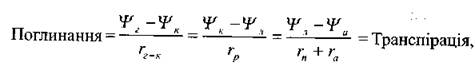де Ψг, Ψк, Ψp, Ψл, Ψа - водні потенціали ґрунту, коріння, рослини в цілому, листя та водяної пари в атмосфері відповідно.