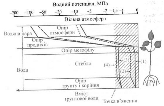 Зменшення водного потенціалу протягом транспортування води в системі ґрунт-рослина-атмосфера наведено на рис. 6.15. Водний потенціал вологого ґрунту, кореневої системи та стебла близький до нуля, що відповідає його максимальному значенню (крива 1). Листя характеризується меншим водним потенціалом, якого все ж таки достатньо для запобігання в'яненню; продихи в такій ситуації відкриті. Зменшення водного потенціалу ґрунту (крива 2) викликає відповідне зменшення водного потоку, водного потенціалу листків, завдяки чому продихи закриваються.