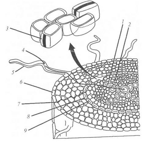 Рис. 6.16. Шляхи транспортування води через кореневу систему симпластним або апопластним шляхом: 1 - флоема, 2 - ксилема 3 - поясок Каспарі 4 - клітинний шлях, 5 - кореневий волосок, 6 - епідерміс, 7 - апопластний шлях, 8 - ендодерма, 9 - поясок Каспарі.