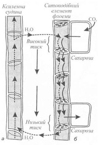 Під час фотосинтезу відбувається перетворення світлової енергії на хімічну, яке супроводжується утворенням вуглеводів з вуглекислого газу. Хоча невелика кількість сполук вуглецю або фотоасимілятів іде на забезпечення процесів росту та метаболізму листя, основна кількість передається нефотосинтетичним органам та тканинам. Процес транспортування фотоасимілятів на довгі відстані називається транслокацією. Розподіл більшості органічних речовин (у першу чергу - фотоасимілятів) по рослині здійснюється завдяки флоемі - другій провідній системі рослини. Флоема являє собою тканину, що складається з кількох типів клітин. Але на відміну від ксилеми провідні елементи флоеми містять протоплазму (рис. 6.17, б). Ці провідні елементи називають ситоподібними клітинами або ситоподібними трубками. Вони з'єднані в єдиний ланцюг, який забезпечує транспортування органічних речовин. Розчинені речовини переміщуються по флоемі - продукти фотосинтезу рухаються від листя до кореневої системи, тоді як цукри у протилежному напрямку, від кореневої системи до верхівки рослини.