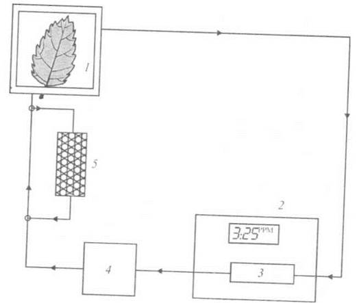 Рис. 7.8. Замкнута система газового аналізу: 1 - камера, що містить зразок, 2 - інфрачервоний газовий аналізатор (ІЧГА), 3 - кювета, 4 - насос, 5 - осушник.