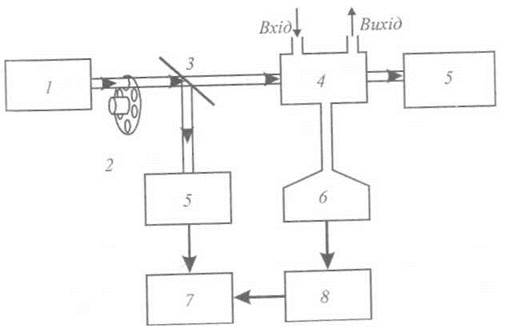 Рис. 7.15. Схема оптико-акустичного спектрометра: 1 - лазер, 2 - модулятор, 3 - напівпрозора пластина, 4 - камера, 5 - детектор, 6 - мікрофон, 7 - підсилювач, 8 - синхронний детектор.