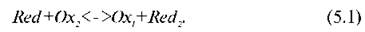 В електрохімічних методах використовують здатність окислювально-відновних реакцій протікати не тільки при безпосередньому контакті, але й при їхньому просторовому розділенні. Розглянемо відновник Red1 та окислювач Ох2, які знаходяться в різних судинах. Якщо в розчини ввести металеві електроди і замкнути ланцюг зовнішнім провідником, а розчини з'єднати сольовим містком (рис. 11.1), то відновник буде віддавати електрони першому електроду Е1 і окислюватися (Red->Ox1). Електрони на зовнішньому ланцюгу перейдуть до другого електрода Е2, який передасть їх окислювачу. Останній відновиться (Red7->Ох2). Таким чином, відбувається реакція: