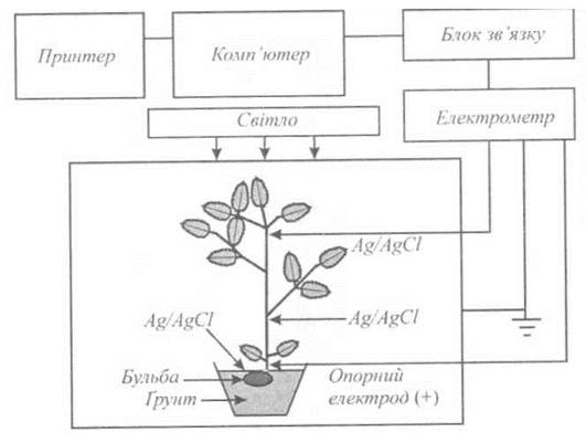 Типову схему приладу для вимірювання потенціалів спокою та дії наведено на рис. 11.3. Індикаторний електрод (Ag/AgCl або Hg7Cl2), який знаходиться у контакті з рослиною, надсилає сигнал до електрометра з високим (200 ТОм) вхідним опором. Електрометр зв'язаний з комп'ютером обробки та аналізу сигналів. Опорний електрод має контакт з основою рослини.