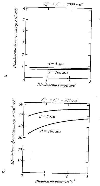 Рис. 12.9. Залежність швидкості фотосинтезу під час інтенсивного освітлення від швидкості вітру: а - для високих значень опорів продихів та мезофілу; б - для низьких значень опорів продихів та мезофілу. Тут d- розмір листка.