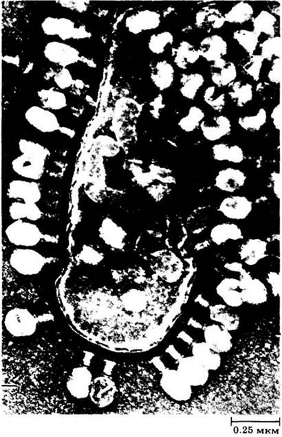 Рис. 12-1. Бактериофаг Т2, инфицирующий клетку Escherichia coli. В результате внедрения вирусной ДНК бактериальная клетка подверглась лизису