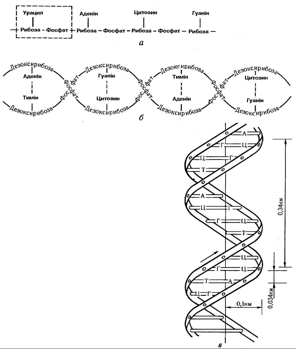 Рис. 147. Схема будови нуклеїнових кислот: а — молекула РНК (виділений один нуклеотид); б — молекула ДНК; в — модель молекули ДНК за Уотсоном і Кріком. Буквами позначені азотисті основи (аденін, тимін, гуанін, цитозин)