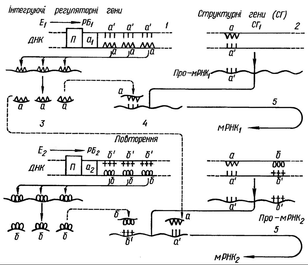 Синтез РНК здійснюється на матриці ДНК. Регуляція процесів транскрипції здійснюється на різних рівнях: шляхом роздріблення хроматину за рахунок модифікації структури гістонів (метилювання їх, фосфорилування та ін.), зміною активності та локалізації РНК-полімераз, через контроль всіх етапів процесингу, а також зв’язуванням матричних РНК в рибонуклеопро- теїнові комплекси (інформосоми) та звільненням їх. Істотну роль в регуляції процесів транскрипції відіграють специфічні негістонові білки, які виступають у ролі активаторів і репресорів, рецепторів фізіологічно активних речовин, фітогормонів, ферментів.