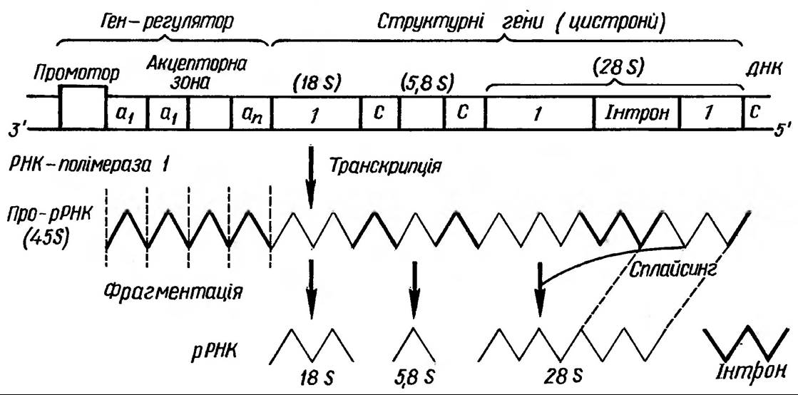 Рис. 149. Структурні гени рРНК, еукаріот, їхня Транскрипція та процесинг: С — спейсер, 1 — екзон