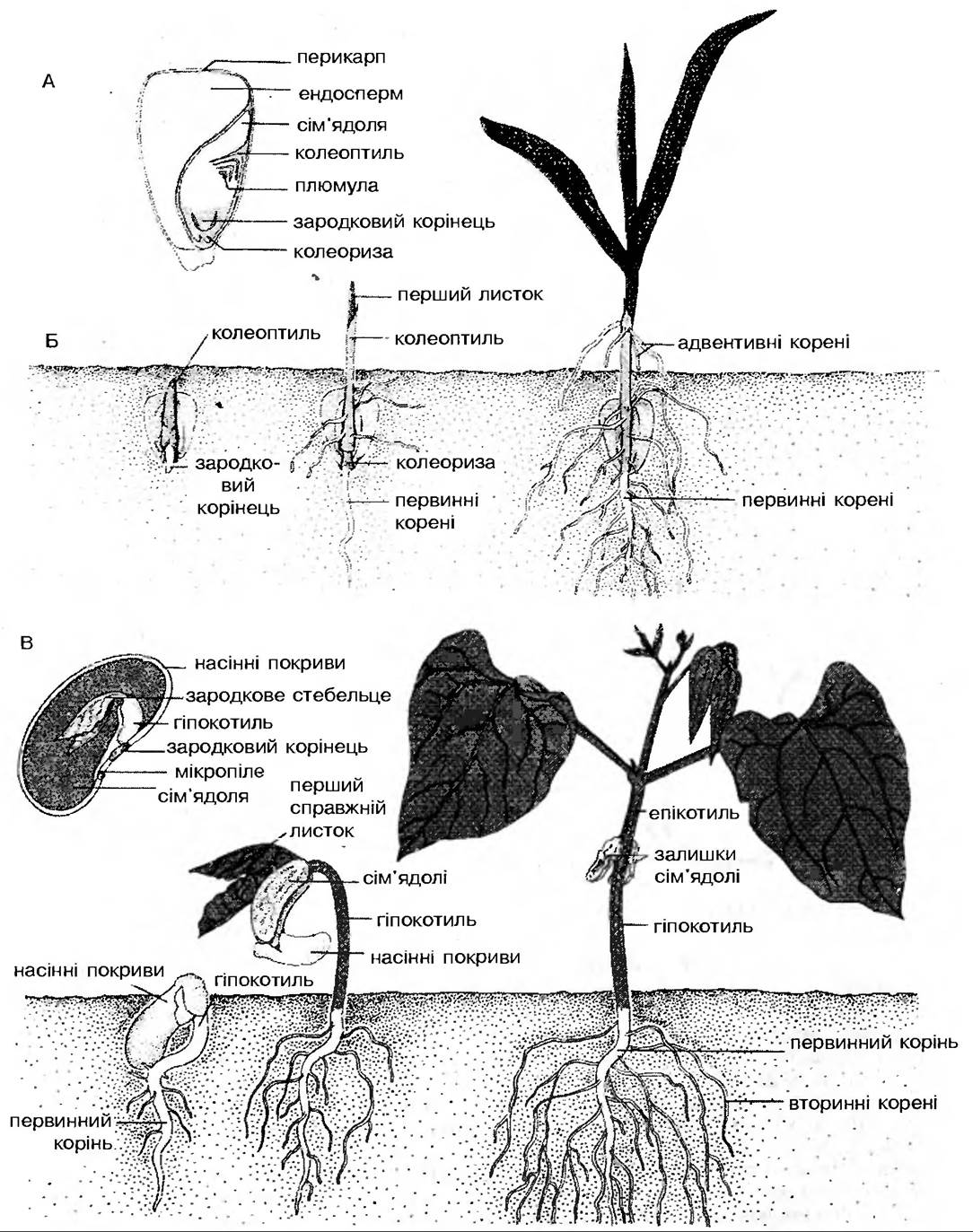 Рис. 160. Проростання насінини (А) і розвиток проростку (Б) однодольних та дводольних (В) рослин