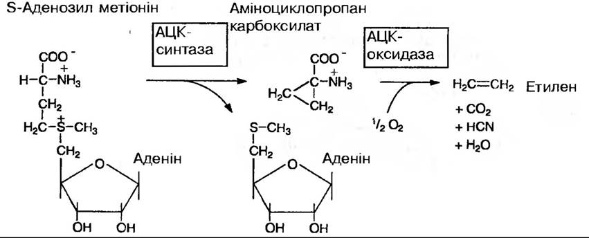 Всі Тканини покритонасінних здатні продукувати етилен, як і папороті, мохи, синьозелені, деякі бактерії. Особливо активно майже всі тканини продукують етилен у відповідь на поранення або в стресових умовах. У вищих рослин він синтезується із метіоніну через S-аденозилметіонін та 1-аміноциклопропан-1 -карбонову кислоту (АЦК), хоча місце внутрішньоклітинного синтезу невідоме (рис. 184).