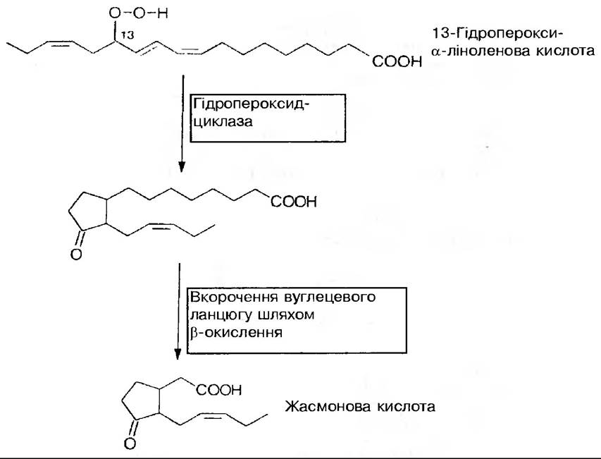 Більш як у 200 родів рослин ідентифікована жасмонова кислота, яка також проявляє подібні до фітогормонів властивості. Її фізіологічні функції in vivo поки мало досліджені, проте встановлено, що екзогенна жасмонова кислота (в концентрації 10-6-10-4 моль×л-1) гальмує ростові процеси і стимулює процеси Старіння ізольованих листків та плодів. Жасмонова кислота синтезується за участю гідропероксидциклази шляхом β-окислення гідропероксиліноленової кислоти: