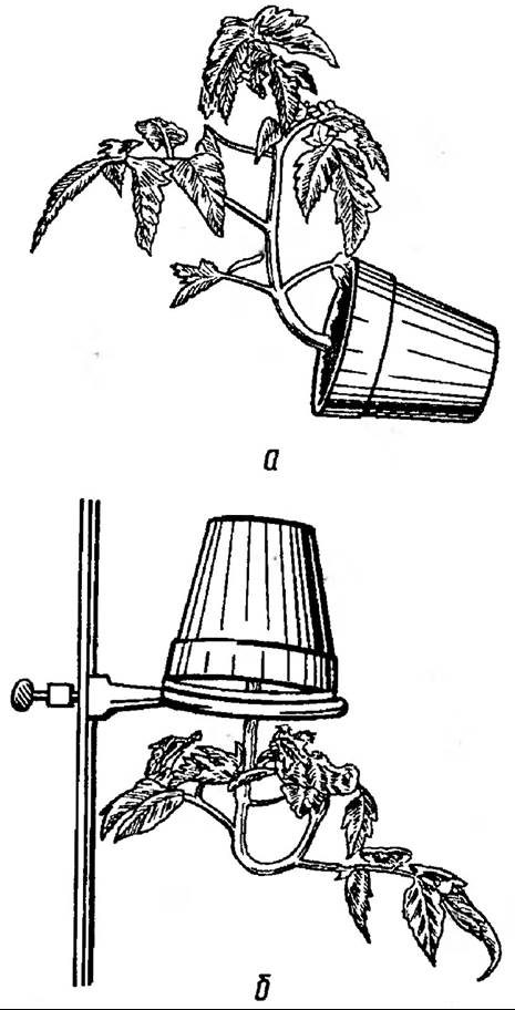 Рис. 205 Гравітропічна реакція пагона молодої рослини помідорів (Lycopersicum esculentum): а — горщик з рослиною був покладений на бік, і знаходився в нерухомому стані, б — горщик з рослиною перевертали і закріплювали вгору дном на кільцевій підставці