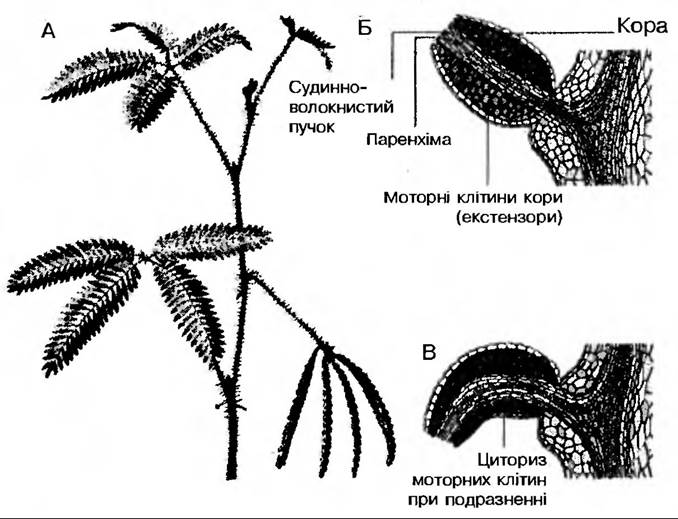 Гіпонастичні рухи, які спостерігаються у відповідь на Дотик, належать до найбільш специфічних рухів, властивих рослинам. Всім відома чутлива рослина мімоза соромлива (Mimosapudica), яка досить чутлива на дотик. У цього виду є і звичайні сонні рухи, але він здатний різко реагувати на "шокові» впливи — сейсмонастіі. Подразнення кінчиків листочків зумовлює згортання їх уже через кілька секунд. Більша сила впливу чи тривалість дії подразника може спричинювати не лише попарне згортання листочків, а і явище поникання всього черешка (рис. 207).