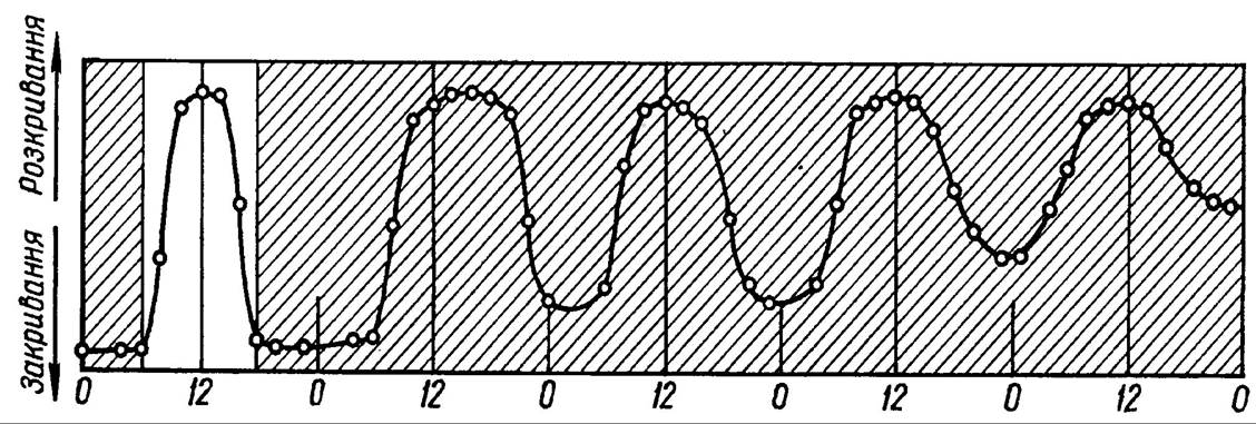 Рис. 208. Продовження руху пелюсток Kalanchoe blossfeldianay неперервній темряві. Темнові періоди заштриховані