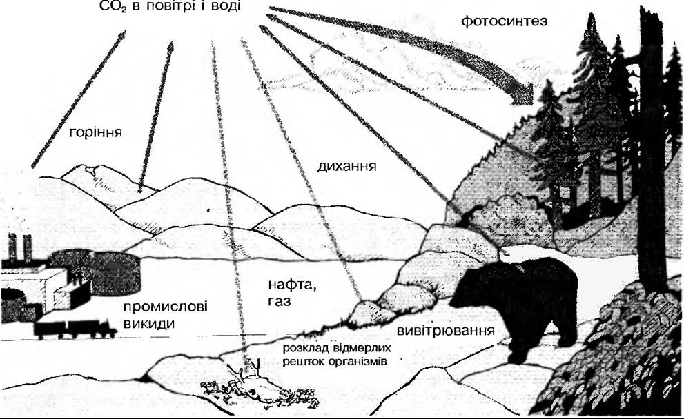 Основний шлях кругообігу вуглецю — з оксиду вуглецю (СО2) атмосфери в живу речовину і назад в оксид вуглецю (рис. 218). Швидкість кругообігу вуглецю в його біогеохімічному циклі є