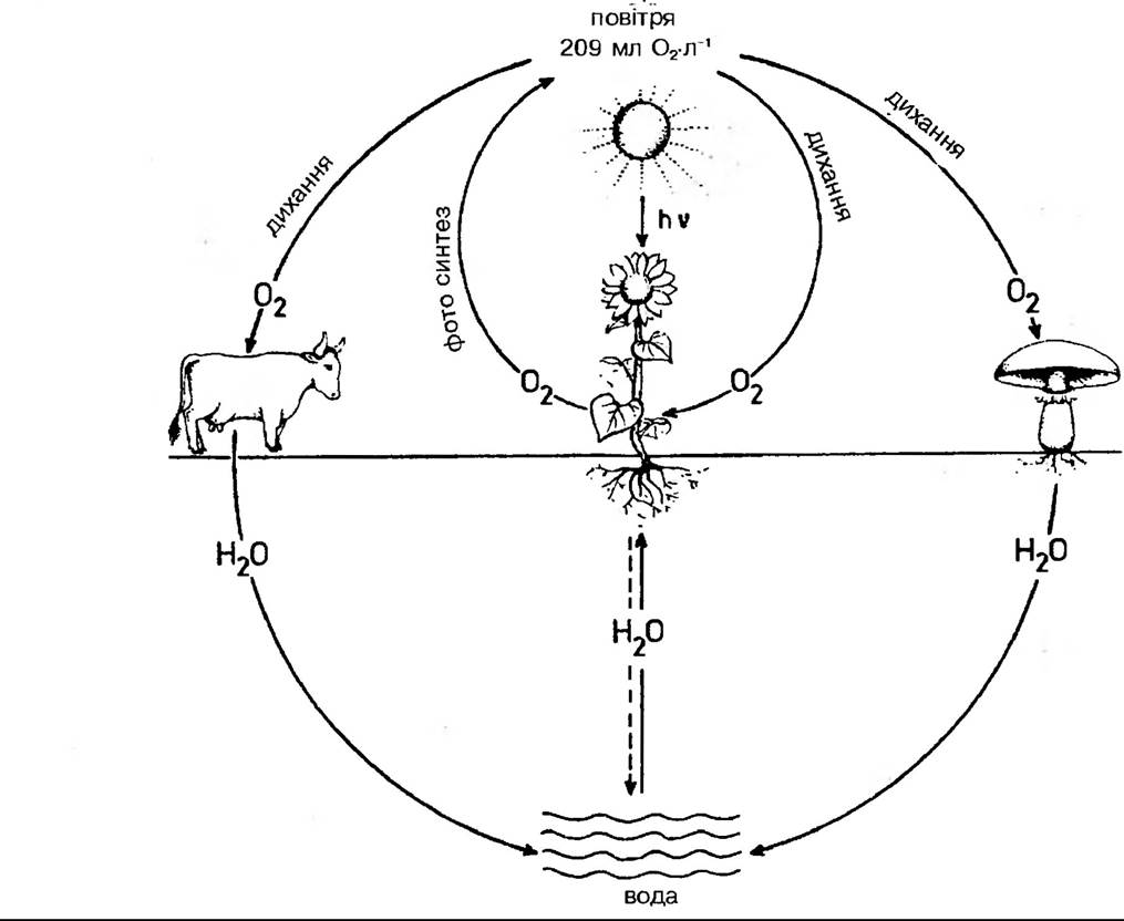 Одночасно щорічна продукція кисню становить 1011т. Кисню в газовій оболонці Землі 1 трильйон 200 млрд. т. Виділення кисню в процесі фотосинтезу, з одного боку, та його використання для Дихання та бродіння, з іншого (враховуючи абіогенне розщеплення Н2О і СО2 ультрафіолетовими променями), сформували впродовж майже 3 млрд. років рівновагу в атмосфері щодо співвідношення між вуглекислим газом та киснем, при якій приблизно 21% складає кисень і 0,03% — СО2. Кисневий цикл (рис. 219) в природі найтісніше взаємоповязаний з вуглецевим. Сучасний пул кисню атмосфери та неорганічних окислених продуктів (оксиди заліза, сульфати тощо) в більшості своїй біогенного походження. Збагачення атмосфери на кисень дало змогу еволюційного розвитку оксидативного дихального метаболізму, як механізму контролю за окисленням відновлених в ході фотосинтезу сполук, що супроводжується вивільненням енергії. Озоновий шар, який захищає розвиток життя на Землі, також певним чином є продуктом фотосинтезу зелених рослин.