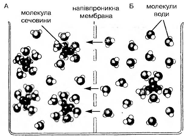 При температурі вище абсолютного нуля всі молекули знаходяться в постійному невпорядкованому і спонтанному русі, що обумовлено їх власною кінетичною енергією. Дифузія — спонтанний процес, що зумовлює переміщення будь-якої речовини з однієї області в сусідню, де концентрація даної речовини менша. Хоча будь-яка молекула здатна рухатися в будь-якому напрямку, реальний потік молекул завжди здійснюється від джерела, де їх концентрація висока, в ті області, де їх концентрація нижче. Тобто, дифузія завжди спрямована від системи, яка володіє більшою вільною енергією, до системи з меншою вільною енергією. Вільною енергією називають частину внутрішньої енергії системи, яка може бути використана на виконання роботи. Вільна енергія 1 моля речовини має назву хімічний потенціал. Хімічний потенціал — функція концентрації і є виміром енергії, яку дана речовина використовує на рух чи хімічні реакції. Чим вище концентрація даної речовини, тим вище її активність, а отже, і її хімічний потенціал. Завдяки постійному руху при змішуванні двох рідин або газів їх молекули рівномірно розподіляться по всьому доступному обємі. Цей процес поширення молекул називають дифузією. Дифузію, отже, можна визначити, як рух молекул або іонів із області з високою концентрацією в область з більш низькою концентрацією, іншими словами як рух за градієнтом концентрації. Дифузійне переміщення речовини завжди відбувається в напрямку від більшого до меншого хімічного потенціалу. Реальна дифузія різних типів молекул або іонів може відбуватися одночасно в різних напрямках, причому кожен тип молекул рухається по своєму градієнту концентрацій. При рівних градієнтах концентрацій менші молекули і іони дифундують швидше від крупніших. Швидкість дифузії залежить від температури, природи речовин і різниці концентрацій. В тому випадку, коли дифундуючі молекули або іони зустрічають на своєму шляху перепону (наприклад, мембрану рослинної клітини), рух сповільнюється, а то й припиняється. Дифузію води в напрямку від свого більшого до меншого хімічного потенціалу називають осмосом. Осмос — це перехід молекул розчинника із області з більш високою його концентрацією в область з більш низькою концентрацією через напівпроникну мембрану (рис. 15).