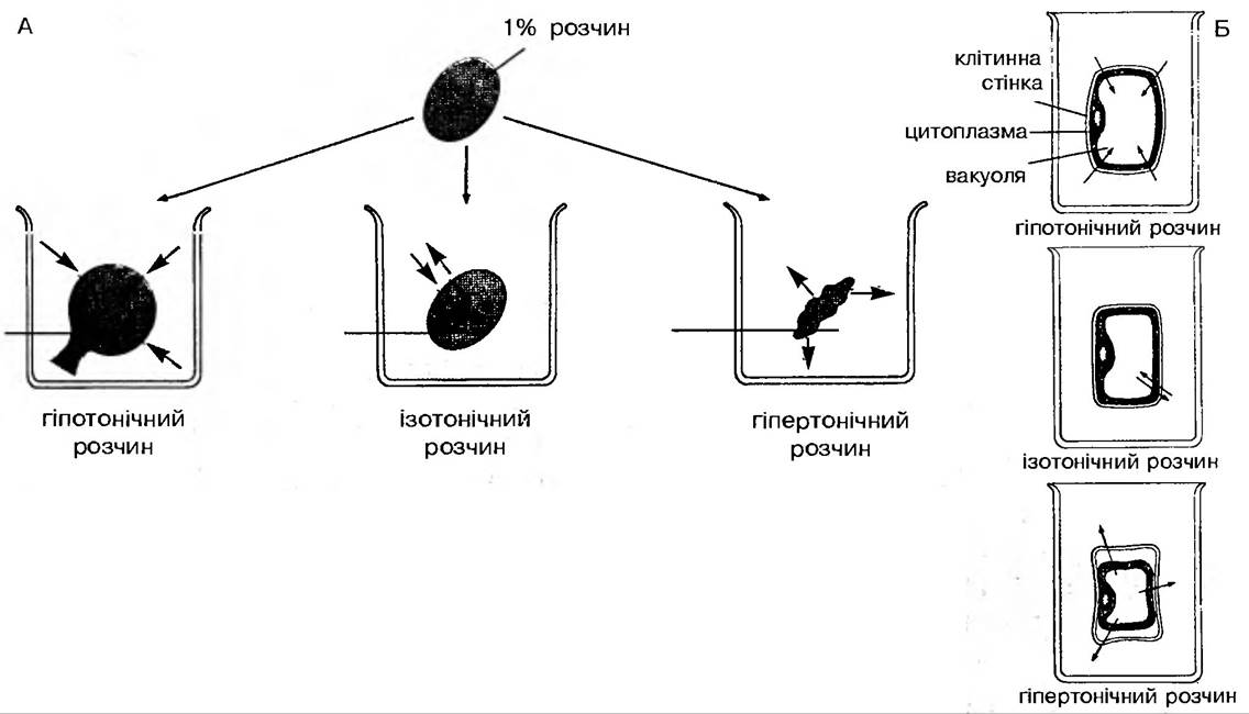 А—розчини різної концентрації, Б — реакція Клітини на вплив, розчинів різної концентрації