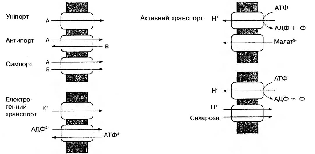 Для рослинної клітини велике значення має Н+-АТФ-аза (водневий насос, або протонна помпа), яка забезпечує перенесення протонів через мембрани, використовуючи енергію гідролізу АТФ. Цей процес супроводжується спряженим оберненим перенесенням катіонів через мембрану (антипорт). Одночасно з іоном водню Н+ в той же бік можуть переноситись аніони (симпорт) (рис. 19). Допускають, що АТФ-аза розташована впоперек мембрани. Звільнена при