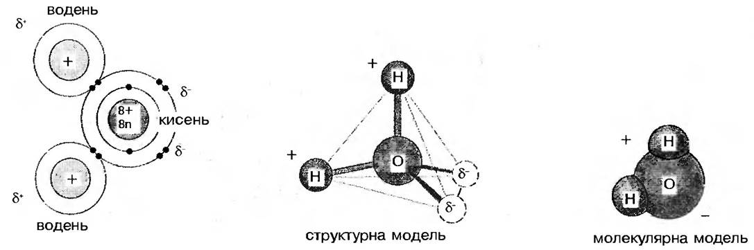 Молекула води складається з атома кисню та двох атомів водню. Водень має позитивно заряджене Ядро (протон) та єдиний від’ємно заряджений електрон (рис. 21).