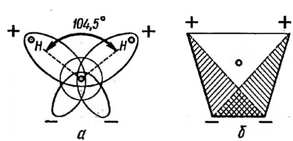 Атом кисню містить 8 протонів та 8 електронів. На його внутрішній та зовнішній орбітах обертаються відповідно 2 та 6 електронів. До стійкої 2-електронної зовнішньої оболонки водню не вистачає одного електрона, а 8-електронної кисню — два, завдяки чому між ними існує спорідненість. В молекулі води це виражається утворенням двох -О-Н зв’язків. Центр молекули води — ядро кисню, а під кутом близько 105° розташовані ядра атомів водню (рис. 22). Зміщення атомів водню на один бік від атому кисню зробило молекулу води полярною, а значить, електрично активною.
