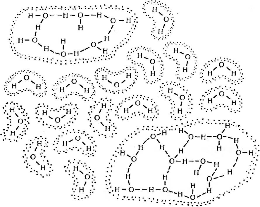 В рідкому стані вода поряд з простими молекулами має і більш складні асоціати (Н2О)n. Саме ця здатність води і зумовлює характерні специфічні особливості води.