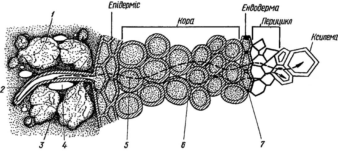 1 — грунтові частинки, 2 — кореневий волосок. З — ґрунтова Вода, 4 — повітряний простір, 5 — симпласт, 6 — апопласт, 7 — поясок Каспарі