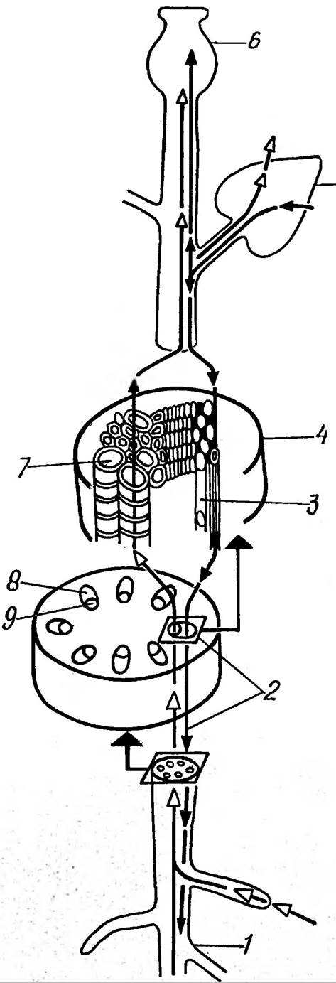 1 — коріння, 2 — вісь пагона, 3 — ситовидна трубка, 4 — провідний пучок, 5 — листок, 6 — плід; 7 судина, 8 — флоема, 9 — ксилема