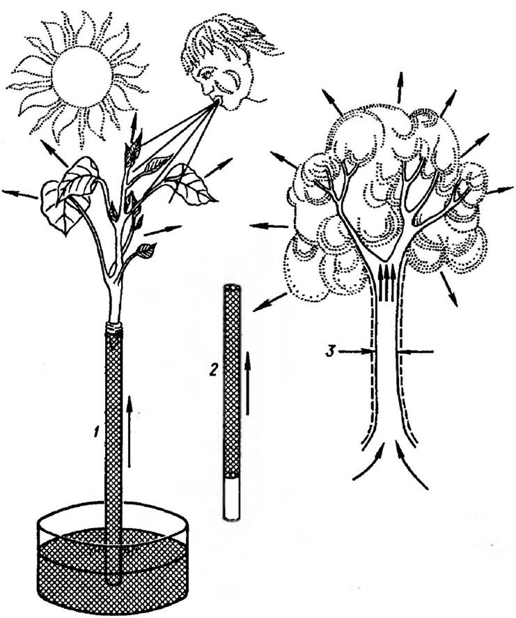 1 — в умовах Інтенсивної транспірації пагін може забезпечувати підняття води на значну висоту, яка перевищує барометричну; 2 — водяний стовпчик, який не містить газу, піднімається як єдине ціле завдяки силі зчеплення між молекулами води; 3 — коли втрата води перевищує її поглинання, в судинах виникає натягнення води і стінки судин зтягуються.