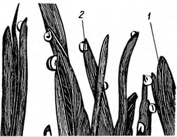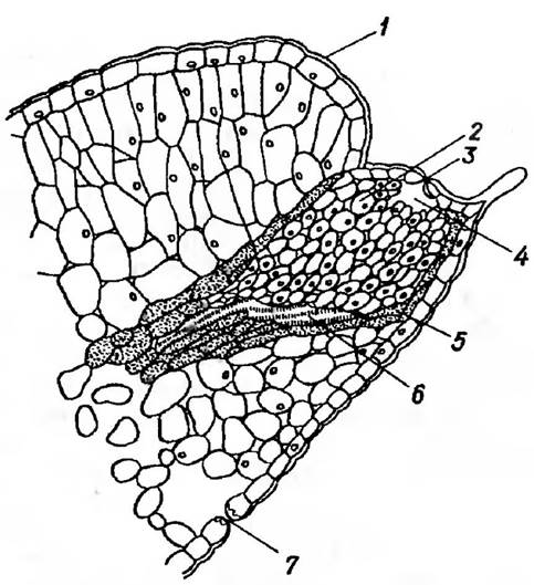 1 — кутикула, 2 — епітема, 3 — водний продих (пора), 4 — субепідермальна порожнина, 5 — обкладинка, 6 — трахеїда, 7 — продихова щілина