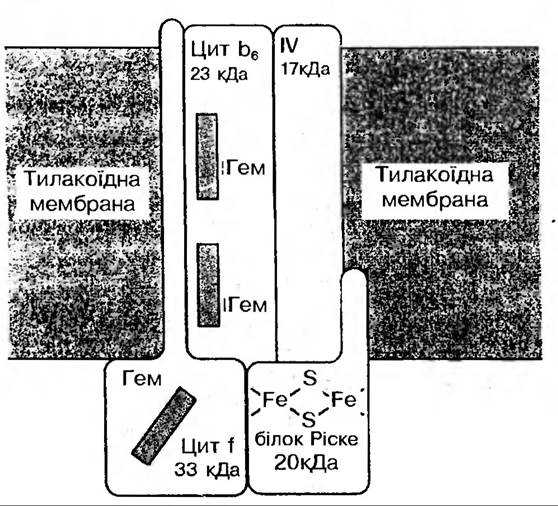 Доведено, що до складу його входить п’ять поліпептидних компонентів: високо- потенціальний Fe-S-центр Ріске (20 кД), цитохром f (33 кД), дві молекули цитохрому b6 (23 кД), а також поліпептид з молекулярною масою 17кД, функції якого поки що невідомі.