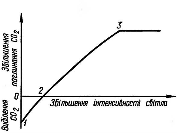 Інтенсивність світла, при якій в міру зростання фотосинтезу компенсується темнове Дихання, називають точкою світлової компенсації, розміщення якої має особливо важливе значення для