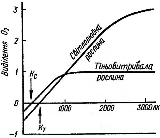 продуктивності фотосинтезу. У тіньовитривалих рослин значення світлової компенсаційної точки становить до 1% від повного насичення, тоді як у світлолюбних — від 3 до 5%. Разом з підвищенням температури вона зміщується в бік більш високих значень освітленості і залежить від виду рослин, етапу онтогенезу та умов довкілля.