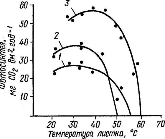 Майже для всіх рослин найсприятливішою є температура в діапазоні 10-35 °С, хоч досить часто пригнічення фотосинтезу спостерігається при порівняно невисоких температурах, вже після 25-30 °С. Деякі рослини пустелі здійснюють фотосинтез при 58 °С. Залежність швидкості фотосинтезу від температури для різних видів рослин подано на рисунку (рис 78). Мінімальна температура для фотосинтезу рослин середньої полоси близько 0 °С.