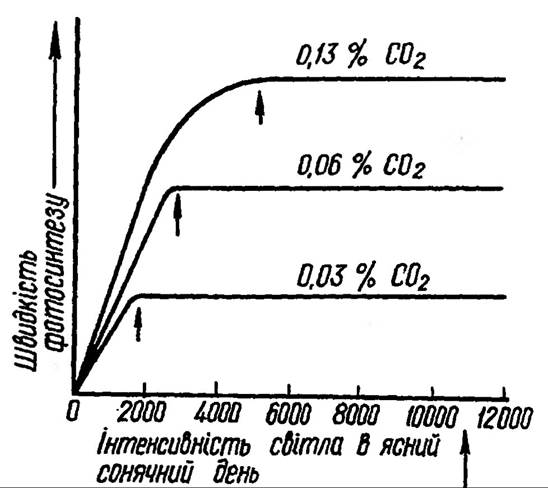 Рослини С4-типу фотосинтезу (кукурудза, просо, сорго) володіють більш високою здатністю до засвоєння СО2 завдяки високій активності ферменту ФЕП-карбоксилази. Процес фотосинтезу може здійснюватися при вмісті СО2 для рослин С3-групи не менше 0,005%, тоді як для рослин С4-групи — 0, 0005%. Характерно, що навіть десятикратне збільшення концентрації СО2 в атмосфері спричинює наростання швидкості фотосинтезу. Насичення відбувається при концентрації 0,2-0,3% (рис. 80). При збільшенні вмісту вуглекислого газу до 15-20% процес фотосинтезу виходить на плато, а потім наступає депресія фотосинтезу. Високі концентрації