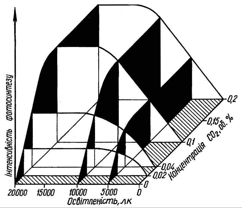 Рис 80. Залежність інтенсивності фотосинтезу від концентрацій СО2 та освітлення